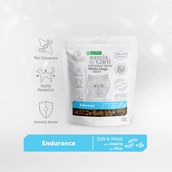 Nature’s Protection White Dogs insektsbasert tilskudd hjelper voksne hunder med å opprettholde sunne tenner og tannkjøtt, samtidig som det gir viktige næringsstoffer for generell helse.
